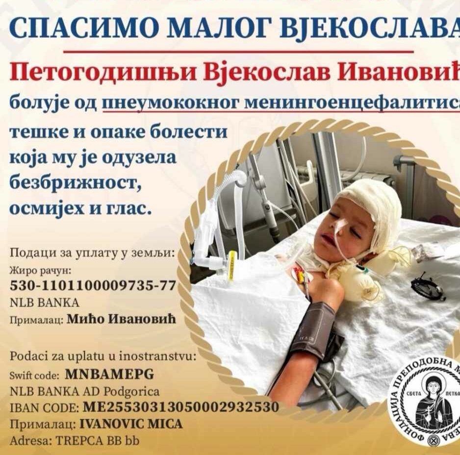 Petogodišnji Vjekoslav Ivanović iz Andrijevice vodi najtežu životnu bitku. Teška bolest oduzela mu je bezbrižno djetnjstvo, glas i osmijeh. U komi je i na lječenju u Podgorici. Za nastavak liječenja u inostranstvu, kada zbog dječakovog stanja bude bio moguć transport, potreban je novac.