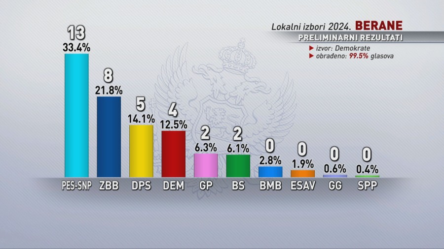 Prema nezvaničnim rezultatima, na osnovu 99,5 odsto obrađenog materijala, lista „Berane na prvom mjestu, PES-SNP“ dobila je 33,41 odsto glasova, odnosno 13 mandata.
