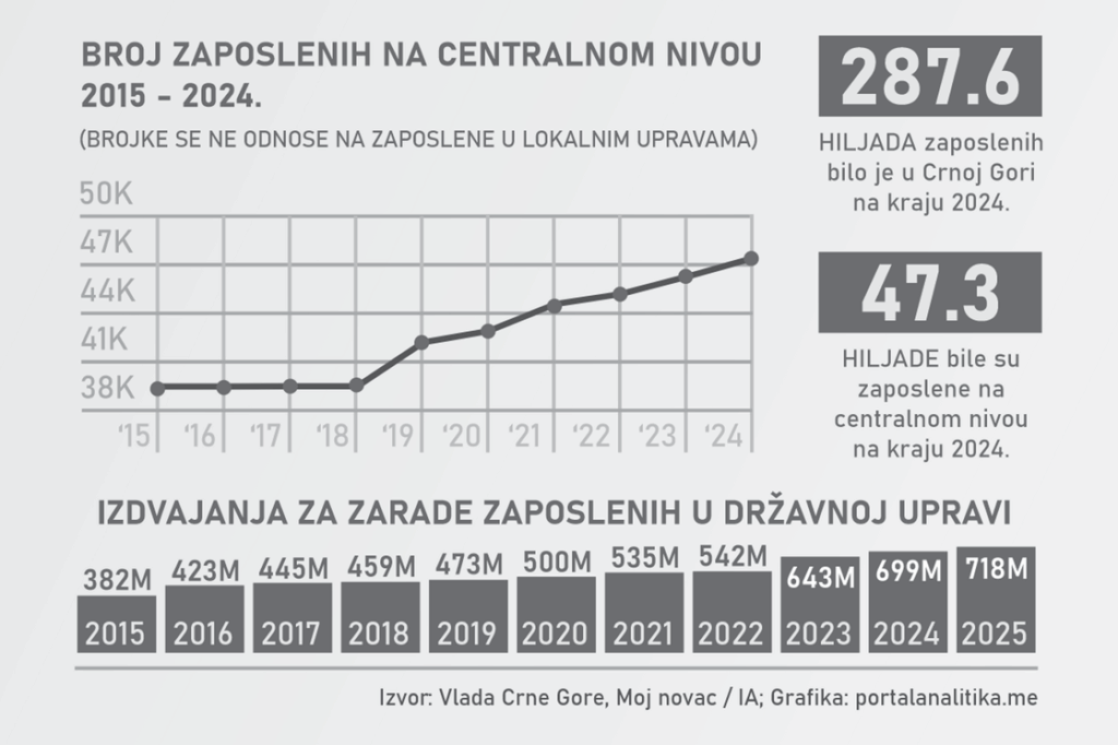 Prema zvaničnim podacima, 2015. godine na centralnom nivou radilo je 39.616 ljudi, a ove 47.506. Sa izuzetkom perioda od 2015. do 2018, kada je bilo izvjesnih pokušaja optimizacije, a svojevremeno je bio uvođen i ‘moratorijum’, kako su godine odmicale tako je broj zaposlenih u državnoj upravi u kontinuitetu bio veći.