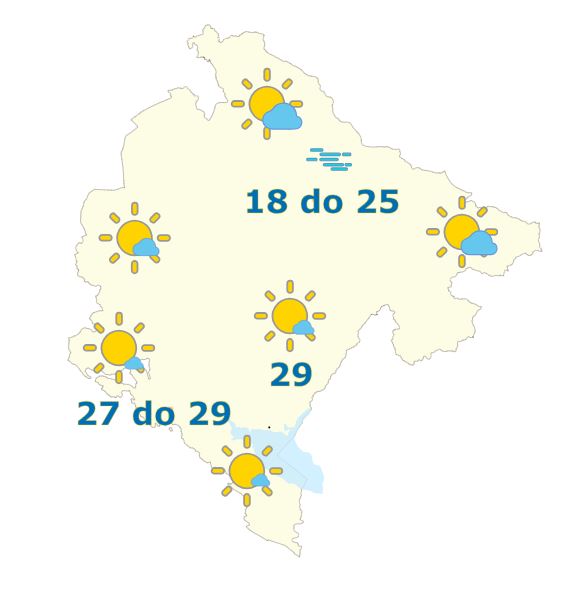 U Crnoj Gori će biti pretežno sunčano i relativno toplo za ovo doba godine, u popodnevnim satima slab do umjeren razvoj oblačnosti. Na sjeveru, u jutarnjim satima, po kotlinama magla, tokom noći naoblačenje, ponegdje može usloviti slabu kišu.