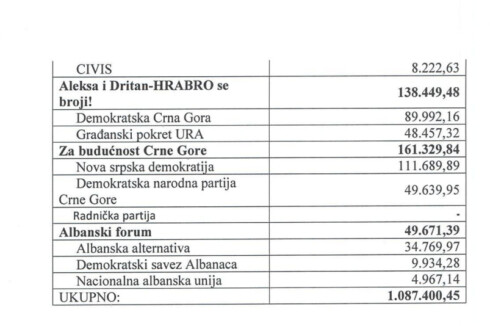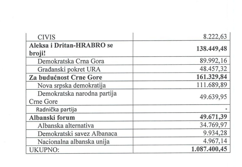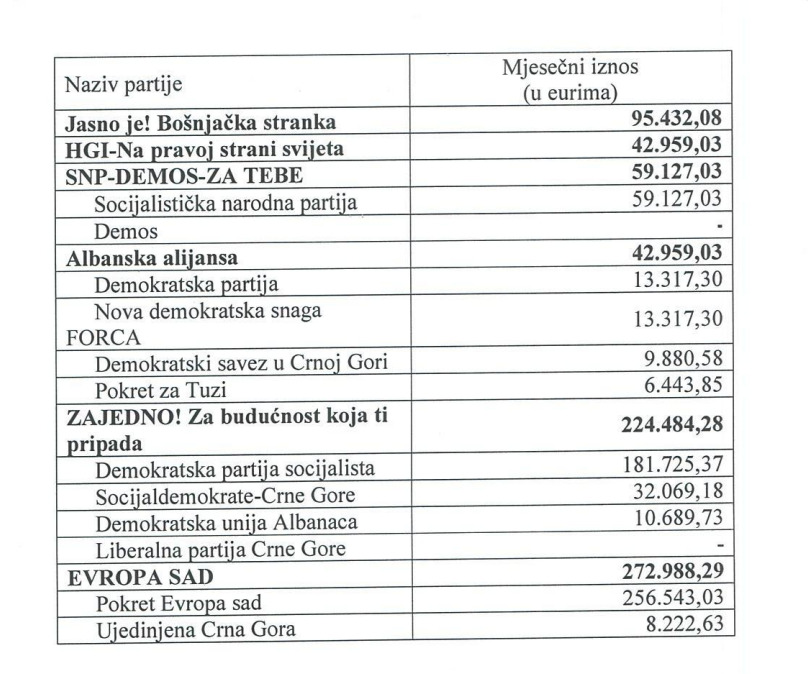 Prema toj odluci mjesečni iznosi koji pripadaju političkim partijama u Skupštini Crne su sljedeći: Bošnjačka stranka 95.432,08 eura, Hrvatska građanska inicijativa (HGI) 2.959,03 eura, Socijalistička narodna partija (SNP) 59.127,03 eura, Demokratska partija 13.317,30 eura, Nova demokratska snaga FORCA 13.317,30 eura, Demokratski savez u Crnoj Gori 9.880,58 eura, Pokret za Tuzi 6.443,85 eura, Demokratska partija socijalista (DPS) 181.725,37 eura, Socijaldemokrate (SD) 32.069,18 eura, Demokratska unija Albanaca (DUA) 10.689,73 eura, Pokret Evropa sad (PES) 256.543,03 eura, Ujedinjena Crna Gora 8.222,63 eura, CIVIS 8.222,63 eura, Demokrate 89.992,16 eura, Građanski pokret URA 48.457,32 eura, Nova srpska demokratija (NSD) 111.689,89 eura, Demokratska narodna partija (DNP) 49.639,95 eura, Albanska alternativa – 34.769,97 eura, Demokratski savez Albanaca 9.934,28 eura i Nacionalna albanska unija 4.967,14 eura.