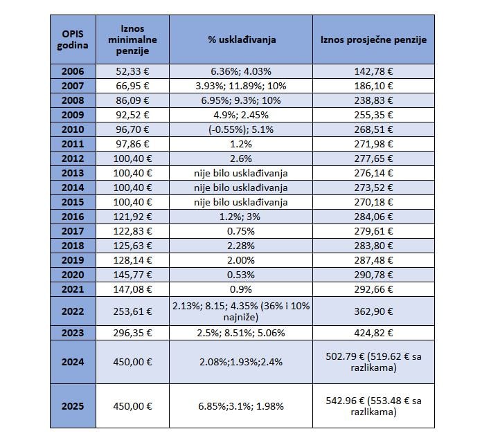 “Shodno članu 58 ovog zakona, usklađivanje penzija se vrši na osnovu zvaničnih statističkih podataka Uprave za statistiku – MONSTAT. Usklađivanje se vrši prema “rotirajućoj” formuli koja uzima u obzir dva ključna parametra: rast/pad potrošačkih cijena (inflacija) i rast/pad prosječnih zarada”, naglasili su.