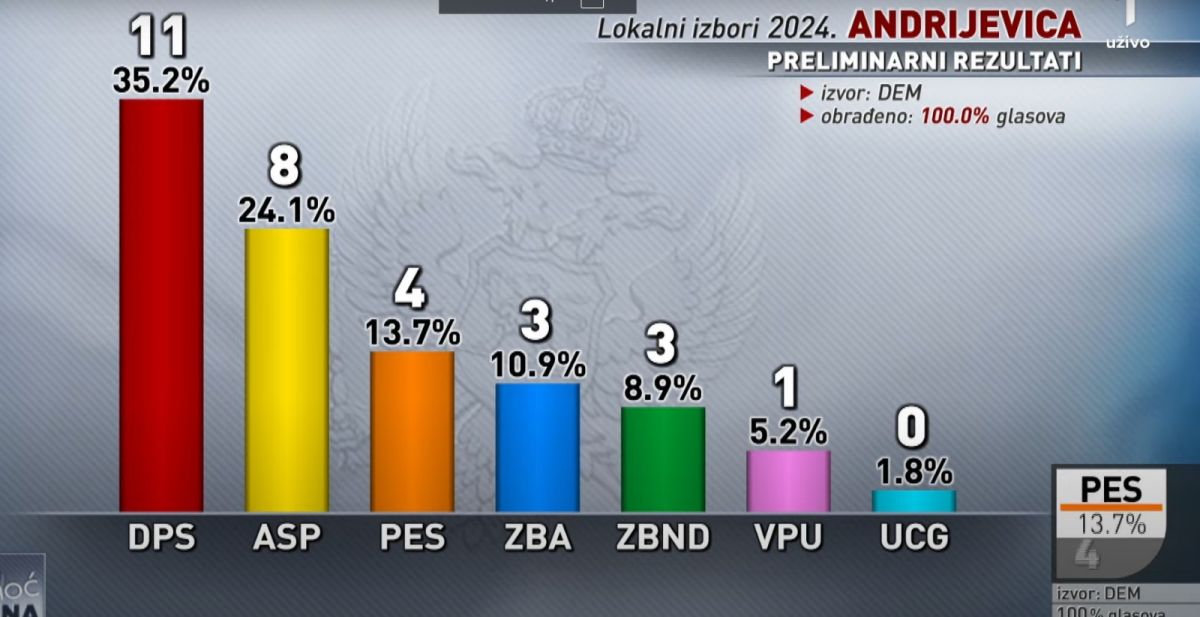 Prema podacima na 100 odsto uzorka, a koje je dostavila Demokratska Crna Gora lista  “Andrijevica Može Bolje” – DPS Srđan Mašović ima 11 mandata,  “SNP -DEMOKRATE- ODVAŽNO. ODLUČNO. ODGOVORNO ANDRIJEVICA SE PITA” 8, “POKRET EVROPA SAD – NOVA ŠANSA ZA ANDRIJEVICU – DR DRAGANA VUČEVIĆ” 4, “ZA BUDUĆNOST ANDRIJEVICE Nova srpska demokratija, Demokratska narodna partija, Prava Crna Gora, Slobodna Crna Gora” 3, Grupa građana “ZA BUDUĆNOST NAŠE DJECE – ANDRIJEVICA” 3 mandata, Grupa građana “VASOJEVIĆKI POKRET UJEDINjENjA VESKO RAKETIĆ” 1, lista “UJEDINjENA CRNA GORA – ZA NAŠU ANDRIJEVICU” nije prešla cenzus.