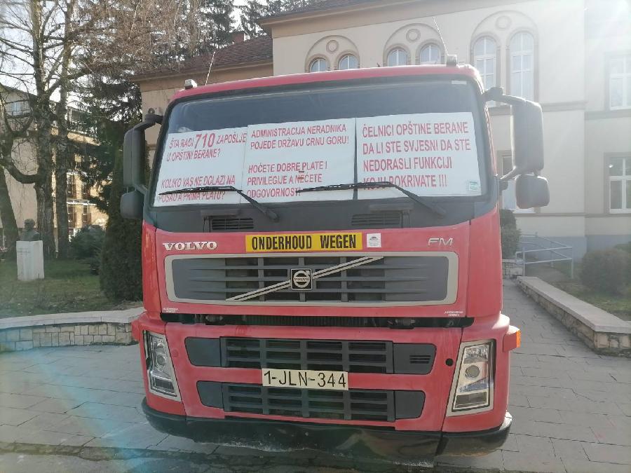 Kamion ispred beranske Opštine oblijepljen je transparentima “Šta radi 110 zapošljenih u Opštini Berane”, “Koliko vas ne dolazi na posao, a prima platu”, “Administracija neradnika pojede državu Crrnu Goru”, “Hoćete dobre plate i privilegije, a nećete odgovornost” i “Čelnici Opštine Berane da li ste svjesni da ste nedorasli funkciji koju pokrivate”.