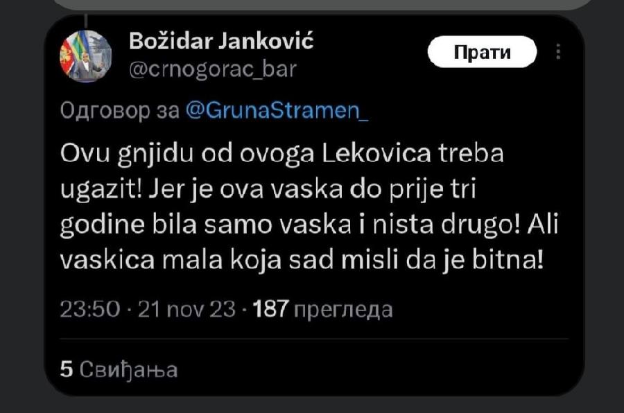 „Ovu gnjidu od ovoga Lekovića treba ugazit! Jer je ova vaška do prije tri godine bila samo vaška i ništa drugo! Ali vaškica mala koja sad misli da je bitna“, napisao je odbornik DPS-a na Tviteru.