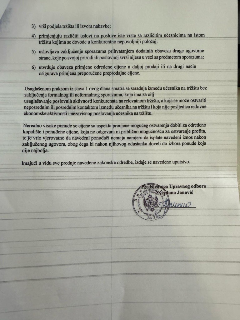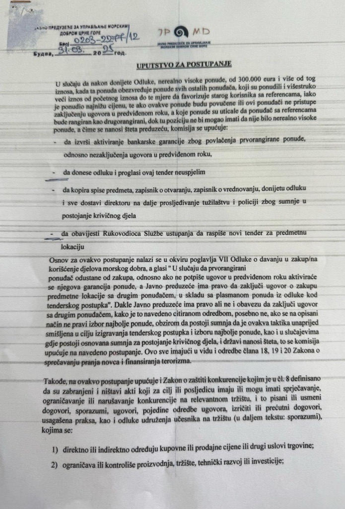 Uputstvo o postupanju koje je JP Morsko Dobro usvojilo NAKON predaje ponuda je klasična zloupotreba službenog položaja. Dovodjenje u zabludu ponuđača jer nijesu imali ovu informaciju kad su predavali ponude. Sve od početka je nezakonito. Jeftina i providna namjestaljka amatera.