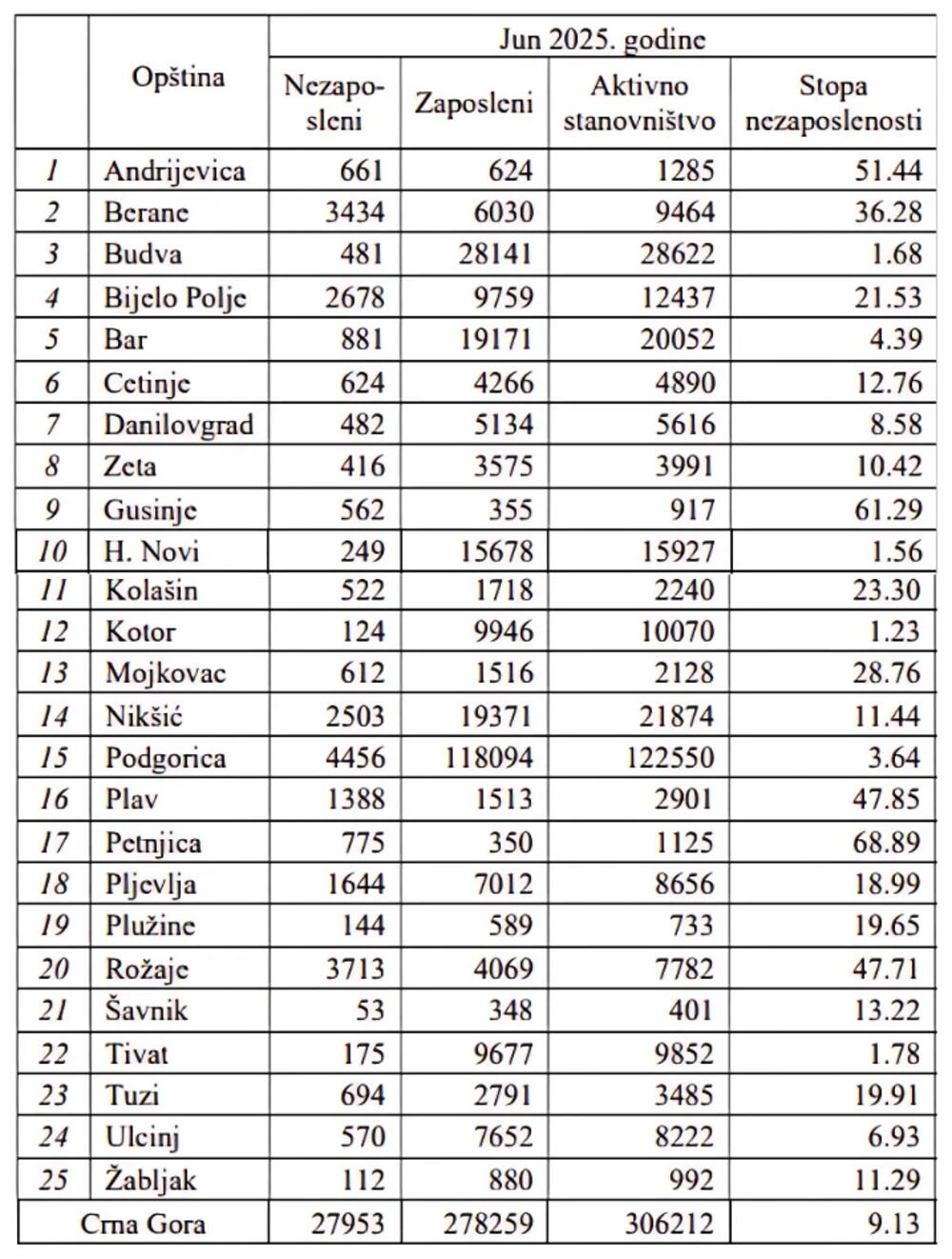 Najveću stopu nezaposlenosti ima Petnjica – 68,89 odsto, Gusinje 61,29 odsto, Andrijevica 51,44 odsto, Plav 47,85 odsto i Rožaje sa 47,71 odsto.