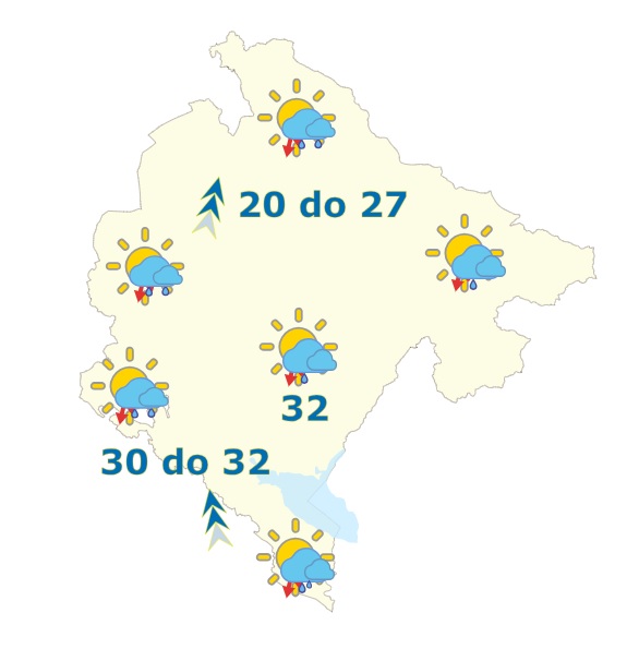 U Crnoj Gori danas će biti promjenljivo oblačno i nestabilno, mjestimično sa kišom, pljuskovima i grmljavinom, naročito u južnim i centralnim predjelima.