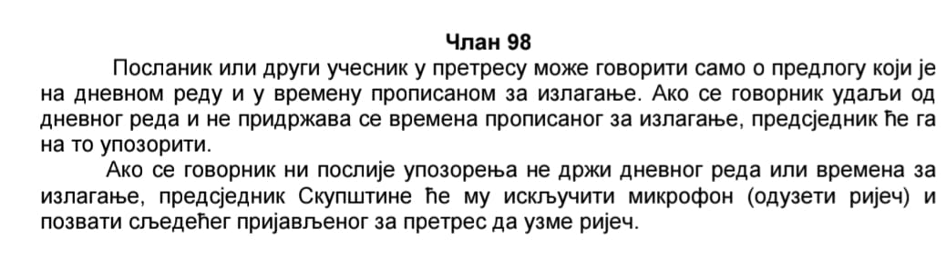 Dodaje da, bez obzira na jasno propisana pravila, do sada je uvijek postojala dobra volja da se svakom poslaniku omoguće diskusije koje se ne odnose isključivo na dnevni red.