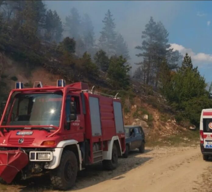 Pripadnici Službe zaštite i spašavanja opštine Pljevlja pokušavaju da spriječe širenje požara, koji se sa livade proširio i zahvatio veću površinu četinarske šume.