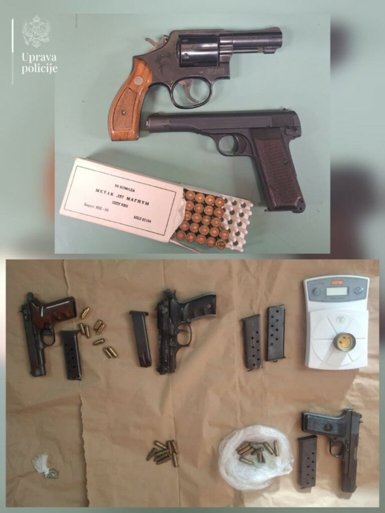 „Policija je kod I.P. (30) iz Budve pronašla i oduzela dva pištolja sa 26 komada municije u ilegalnom posjedu, startni pištolj, drobilicu, vagu za precizno mjerenje i jednu pvc kesicu sa sadržajem opojne droge marihuane“, rečeno je iz poilicije.