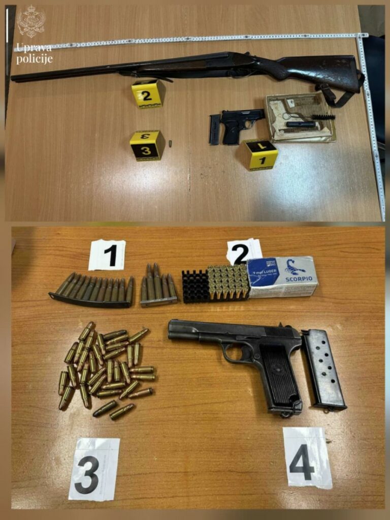 „Policijski službenici su u Beranama izvršili pretres stana i drugih prostorija koje koristi lice S.Š. (24) i kod njega pronašli i oduzeli pištolj marke Zastava M57 i 79 komada municije, u ilegalnom posjedu. Pretresom stana koji koristi N.B. (27) pronađeno je devet komada municije nepoznatog kalibra, u ilegalnom posjedu“, navode iz policije.