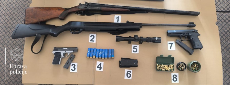 „Naime, na osnovu prethodno pribavljene naredbe suda, policijski službenici u Beranama su, pretresom kuće i pomoćnih objekata koje koristi D.B. (51) pronašli i oduzeli lovačku pušku, pištolj kalibra 7,65 mm, vazdušnu pušku i gasni pištolj, kao i 97 komada municije različite vrste i kalibra, koji su se nalazili u ilegalnom posjedu“, saopšteno je iz Uprave policije.