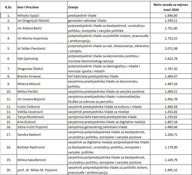 Plata premijera Milojko Spajić u martu je iznosila 1.895 eura, potpredsjednika Vlade za politički sistem, pravosuđe i antikorupciju Moma Koprivice 1.732 eura, a potpredsjednika Vlade za bezbjednost, unutrašnju politiku, evropske i vanjske politike Alekse Bečića 1.721 euro, objavljeno je na sajtu Vlade.