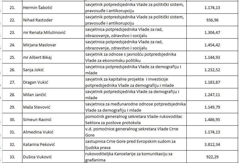 Potpredsjednik Vlade za rad, obrazovanje, zdravstvo i socijalu Srđa Pavićević u martu je primio 2.072 eura, potpredsjednik Vlade za ekonomsku politiku i ministar ekonomskog razvoja Nik Đeljošaj 1.824 eura i potpredsjednik Vlade za demografiju i mlade i ministar sporta i mladih Dragoslav Šćekić 1.787 eura