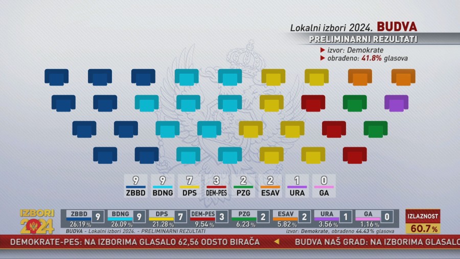 Prema preliminarnim podacima, na današnjim lokalnim izborima u Budvi najviše glasova osvojili su koalicija „Za budućnost Budve“ i lista „Budva naš grad“. Ovo su podaci na 41,81 odsto prebrojanih glasova. U lokalnom parlamentu ima 33 odbornička mjesta.