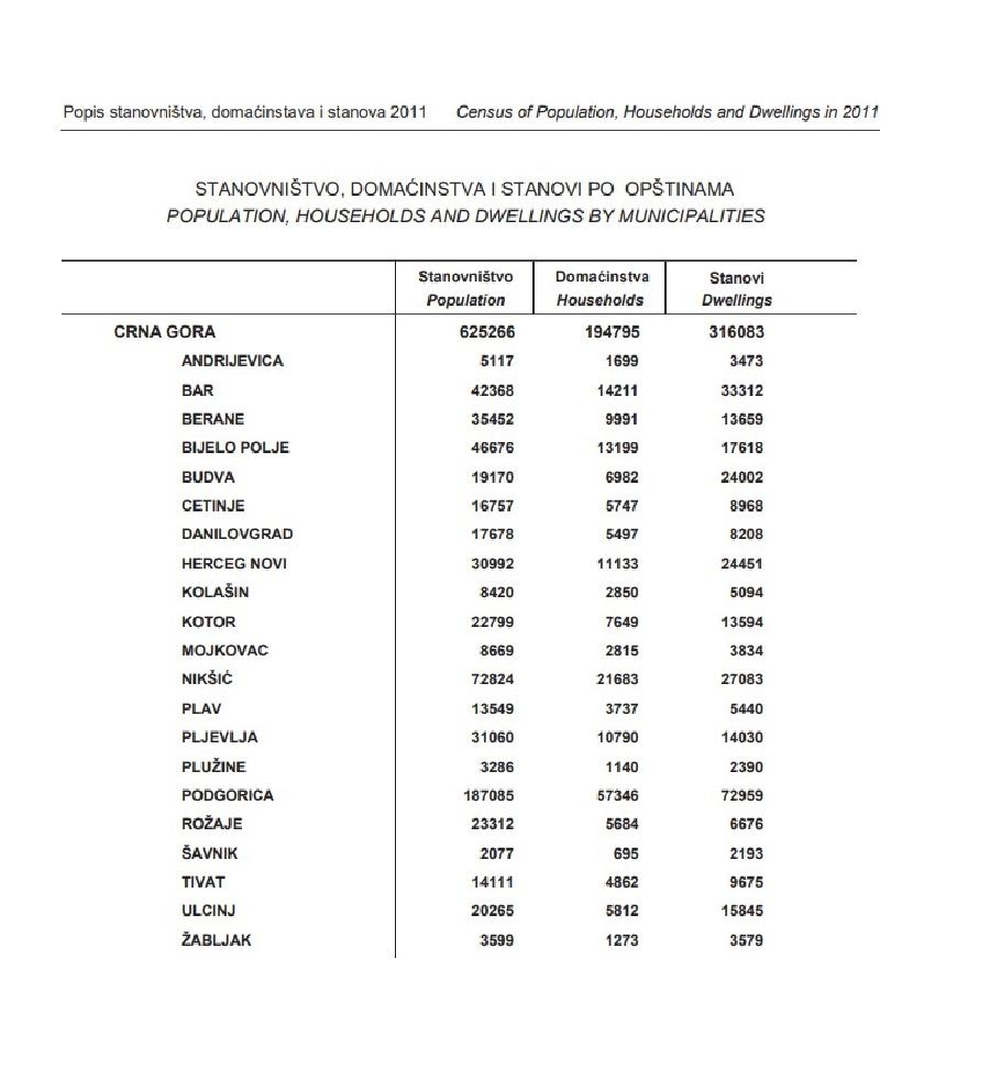 Stanovništvo, domaćinstva i stanovi, 2011. godine (Izvor: Monstat)
