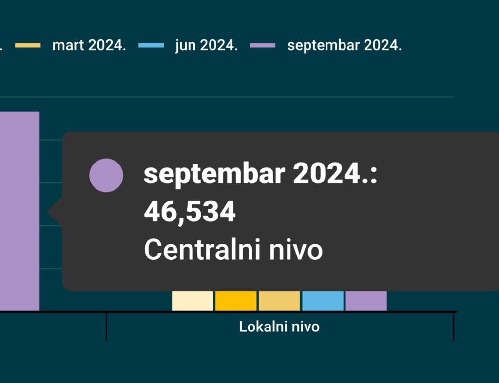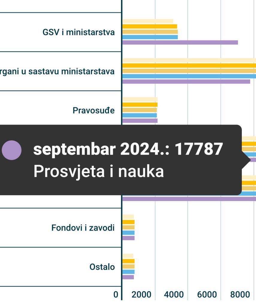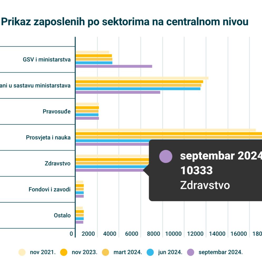 Zaposlenih u javnoj upravi na centralnom nivou u septembru bilo je 46.534, a na lokalnom nivou 7.114 što nas dovodi do ukupnog broja 53.648 zaposlenih., pokazuju podaci Ministarstva javne uprave