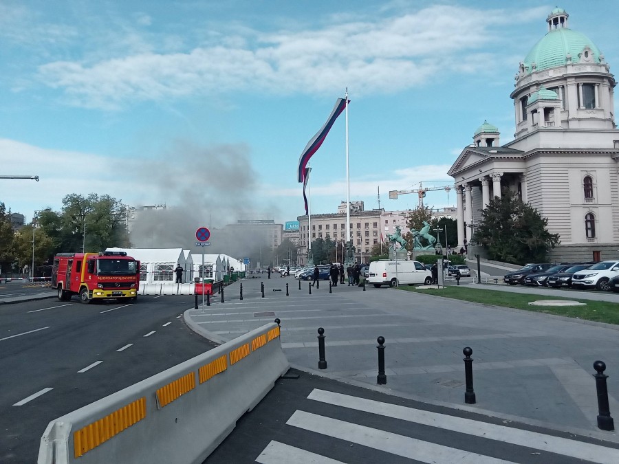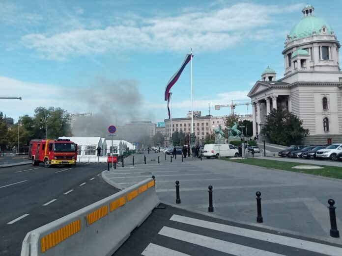 Na platou ispred Narodne skupštine u Beogradu desila se pucnjava, a nakon toga i požar, prenose srpski mediji.